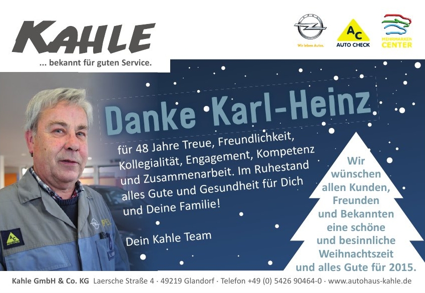 Am 21.11.2014 verabschiedeten wir unseren Serviceberater und Ersatzteil-Fachmann nach fast 48 Jahren in den Ruhestand. Bereits seine Lehre absolvierte Karl-Heinz in unserem Betrieb und nicht nur wir als Kahle-Team, auch die Kunden, schätzten seine zuverlässige, kompetente Arbeitsweise und Freundlichkeit. Vielen Dank für die Treue zum Autohaus Kahle!